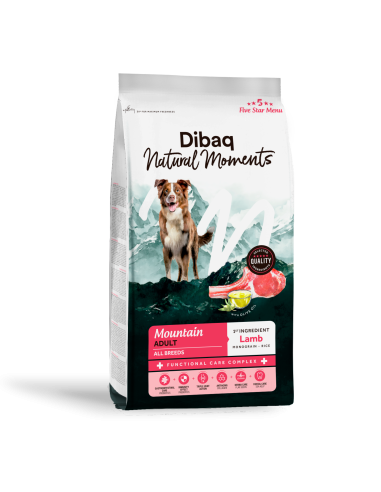 Dibaq Natural Moments Dog Mountain is a food formulated for adult dogs of all breeds, ideal for those looking for functional nutrition based on natural and digestive ingredients. Its recipe stands out for its high content of lamb (20%) and turkey (18%) as the main sources of animal protein, accompanied by rice as the only cereal (monograin), which makes it a hypoallergenic, tasty and easily digestible feed. Available in 2 and 12 kg formats, it offers adapted kibbles (13.5-16.5 mm) for comfortable chewing.