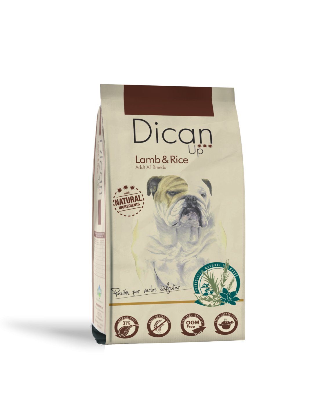 Dican Up Lamb and Rice is a food for adult dogs of all breeds with medium-high physical activity. Recipe made with lamb, rice and natural plants.
