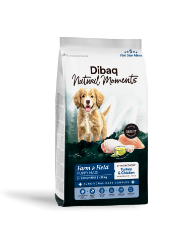 Dibaq Natural Moments Farm & Field Puppy Maxi is a feed specifically formulated for large breed puppies, who need nutrition adapted to their rapid growth and the development of bones and joints. Made with 41% turkey and chicken as a source of high-quality animal protein, and rice as the only cereal (monograin), this recipe offers optimal digestion, great palatability and a controlled energy source (3,650 kcal/kg) to promote balanced development. Available in 2 kg and 12 kg formats, with adapted kibbles of larger size (12-16 mm) for correct chewing.