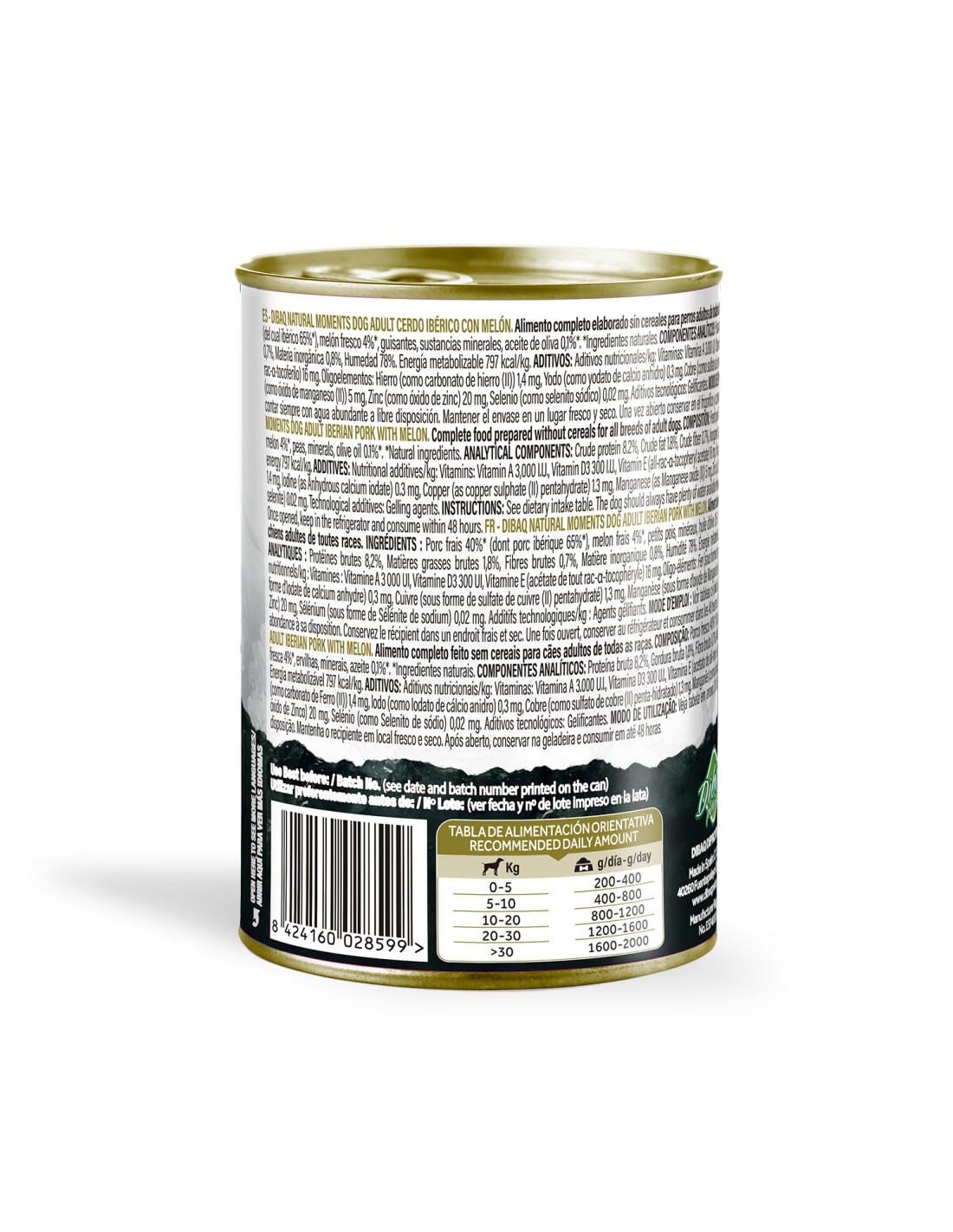 Fresh pork 40%* (of which Iberian 65%*), fresh melon 4%*, peas, minerals, olive oil 0.1%*. *Natural ingredients.