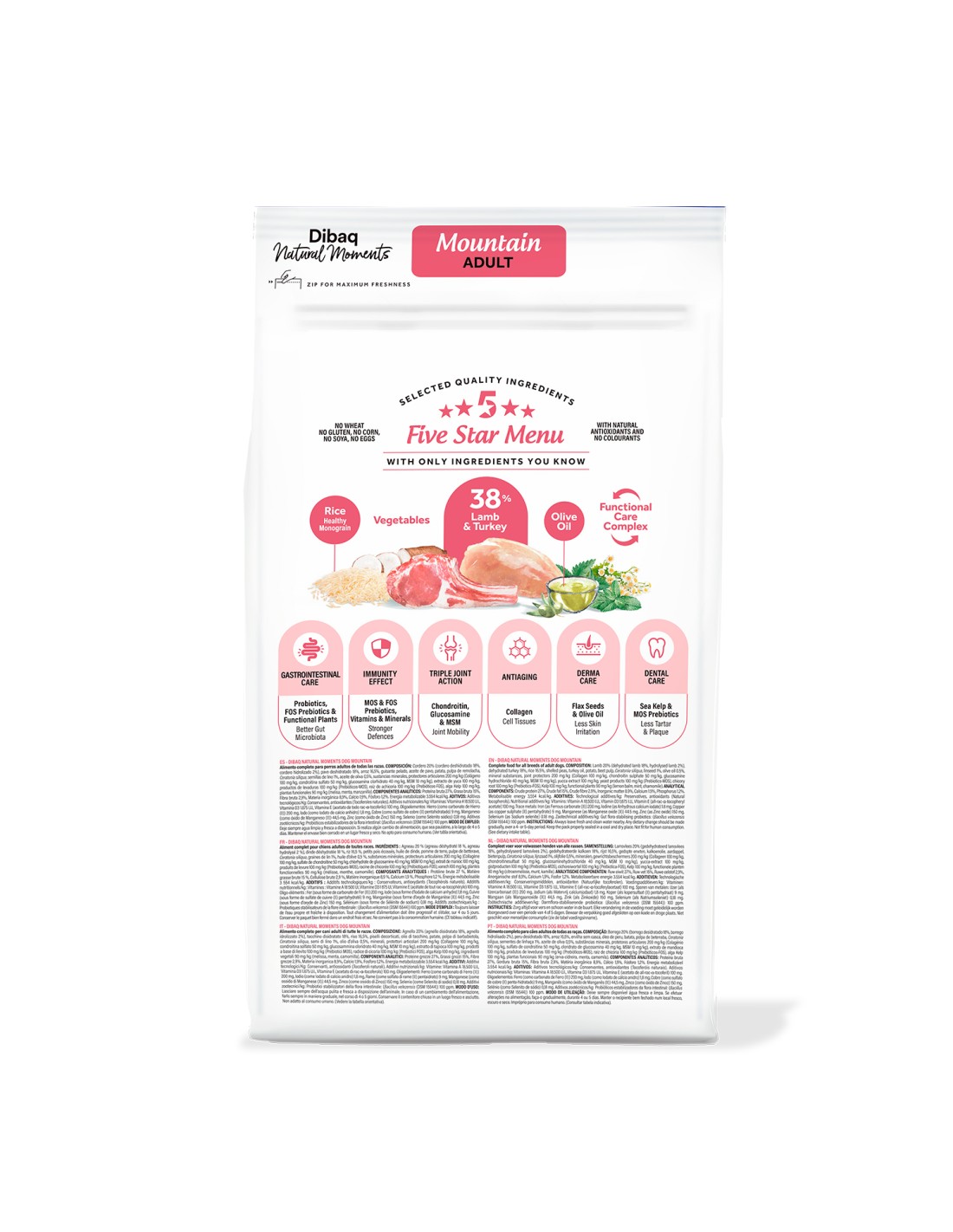Enriquecido con un exclusivo Functional Care Complex, este alimento contribuye a la salud integral de tu perro gracias a la incorporación de prebióticos MOS y FOS, probióticos, semillas de lino, aceite de oliva, extracto de yuca, alga Kelp y plantas funcionales como melisa, menta y manzanilla. Además, su contenido en colágeno, condroitina, glucosamina y MSM protege y mejora la movilidad articular, mientras que el efecto Derma Care y Dental Care refuerza el bienestar de la piel, el pelaje y la higiene bucal. Sin trigo, gluten, maíz, soja ni colorantes artificiales, Dibaq Mountain es una opción natural, segura y deliciosa que combina tradición mediterránea con ciencia nutricional para mantener a tu perro adulto fuerte, sano y feliz cada día.