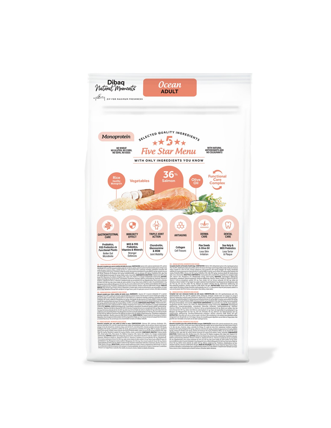 Este alimento premium incorpora el exclusivo Functional Care Complex, con prebióticos FOS y MOS, probióticos, extracto de yuca, alga Kelp, semillas de lino, aceite de oliva y plantas funcionales como melisa, menta y manzanilla. Además, incluye condroitina, glucosamina, MSM y colágeno para proteger las articulaciones y favorecer una movilidad óptima. Su perfil nutricional está pensado para fortalecer el sistema inmune, mejorar la salud digestiva, proteger la piel frente a irritaciones y cuidar la salud bucodental. Sin trigo, gluten, maíz, soja ni colorantes artificiales, Dibaq Ocean es una opción completa, segura y deliciosa que combina lo mejor del mar con la nutrición natural más avanzada.