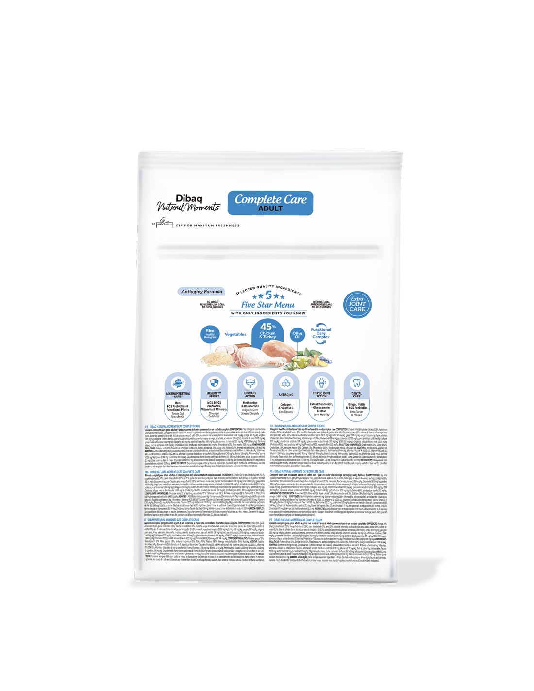 Este alimento incorpora el Functional Care Complex, que combina prebióticos MOS y FOS, extracto de malta, taurina, metionina, colágeno, condroitina, glucosamina, MSM y vitamina C, junto a una potente mezcla de plantas funcionales (romero, valeriana, ortiga, camomila, alcachofa, etc.), aceites saludables (oliva y salmón), y arándanos para la salud urinaria. Esta combinación favorece una digestión eficiente, fortalece el sistema inmunológico, protege las articulaciones, previene el envejecimiento celular y ayuda a reducir la formación de sarro. Además, su bajo contenido en grasas (12%) y su fórmula libre de trigo, maíz, gluten, soja, huevos y colorantes artificiales, lo convierten en la opción ideal para mantener a tu gato activo, protegido y en equilibrio en todas las etapas adultas de su vida.