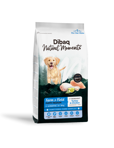 Dibaq Natural Moments Farm & Field Puppy Medium, disponible en formatos de 2 kg y 12 kg, es un pienso natural especialmente formulado para cachorros de razas medianas. Con un 43% de pavo y pollo como fuentes de proteína de alta calidad, y arroz como único cereal (monograno), este pienso favorece una digestión suave y un desarrollo saludable. Sus croquetas, adaptadas en tamaño (7-10 mm), son ideales para bocas medianas y tienen un sabor irresistible que encanta a los cachorros.