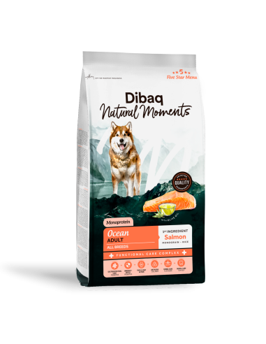 Dibaq Natural Moments Dog Ocean es un pienso natural formulado para perros adultos de todas las razas, ideal para quienes buscan una dieta sabrosa, saludable y rica en ácidos grasos omega 3 y 6. Elaborado con un 36% de salmón (monoproteína) como fuente principal de proteína animal y arroz como único cereal (monograno), esta receta es altamente digestible, hipoalergénica y perfecta para cuidar la piel y el pelaje desde dentro. Disponible en formatos de 2 kg y 12 kg, con croquetas adaptadas (13,5-16,5 mm) para una masticación cómoda y eficaz.