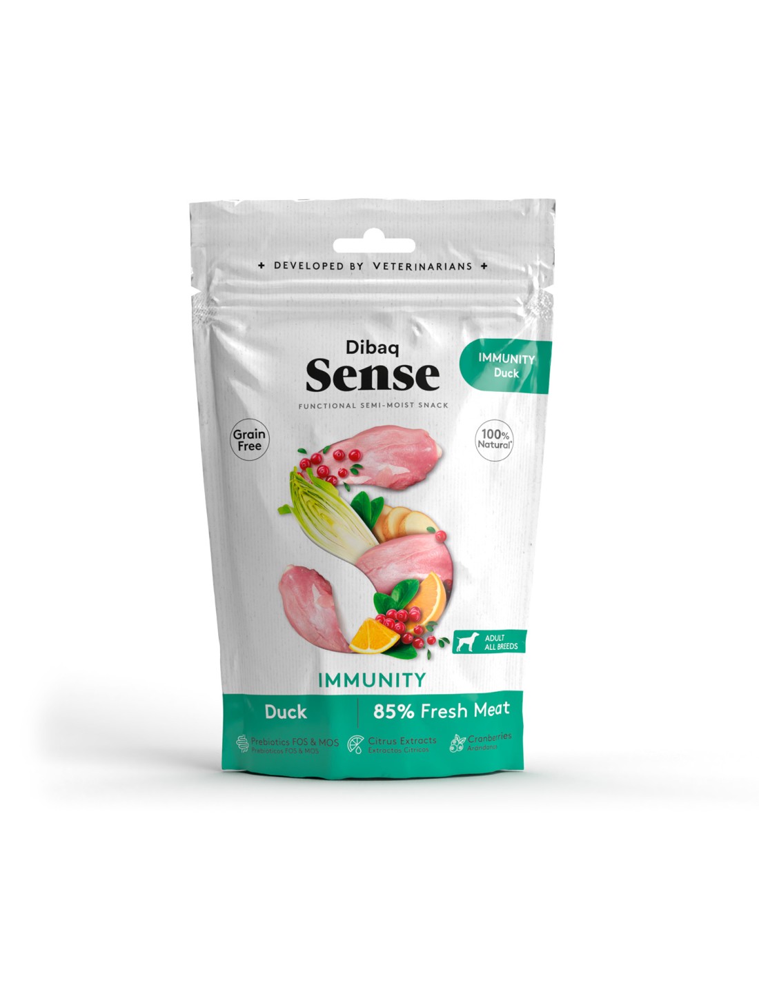 Dibaq Sense Snack Inmunity es un Snack semi húmedo elaborado con carnes frescas de pato y pavo, patata y arándanos rojos frescos. Ingredientes naturales que contribuyen a reforzar su sistema inmunológico.