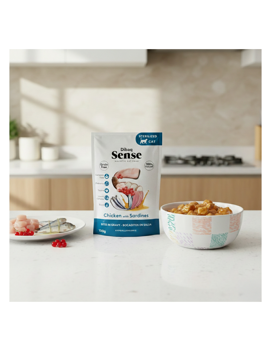 Alimento hipoalergénico completo para gatos adultos esterilizados. Deliciosas mordidas em molho de frango com sardinha, prebióticos, biotina, taurina e complexo urinário. Receita sem grãos