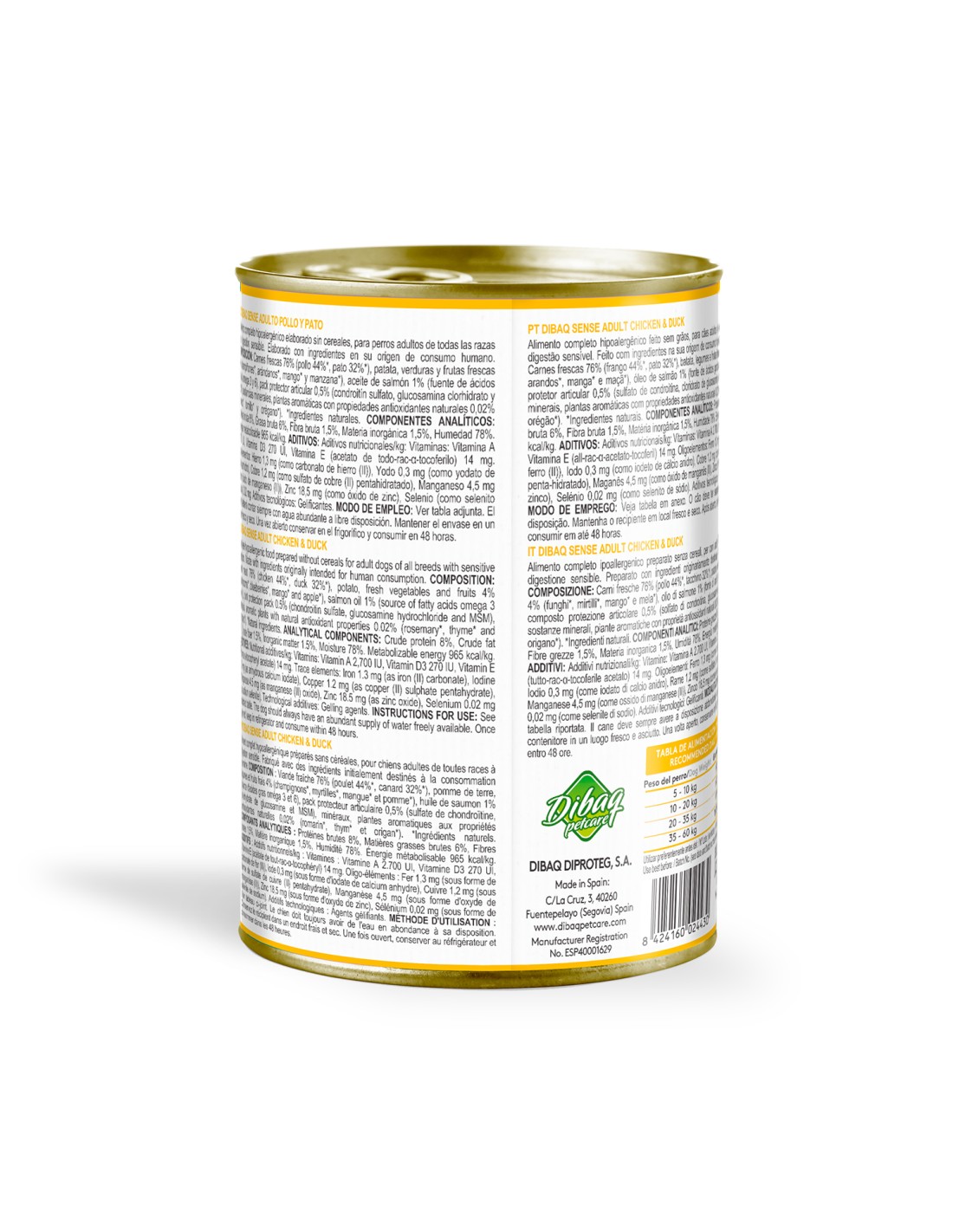 Dibaq Sense Frango e Pato Grain Free para cães adultos de todas as raças é um alimento úmido hipoalergênico feito com carne fresca de frango e pato, frutas e vegetais frescos (cogumelos, mirtilos, manga e maçã), protetor de articulações, plantas prebióticas e antioxidantes naturais.