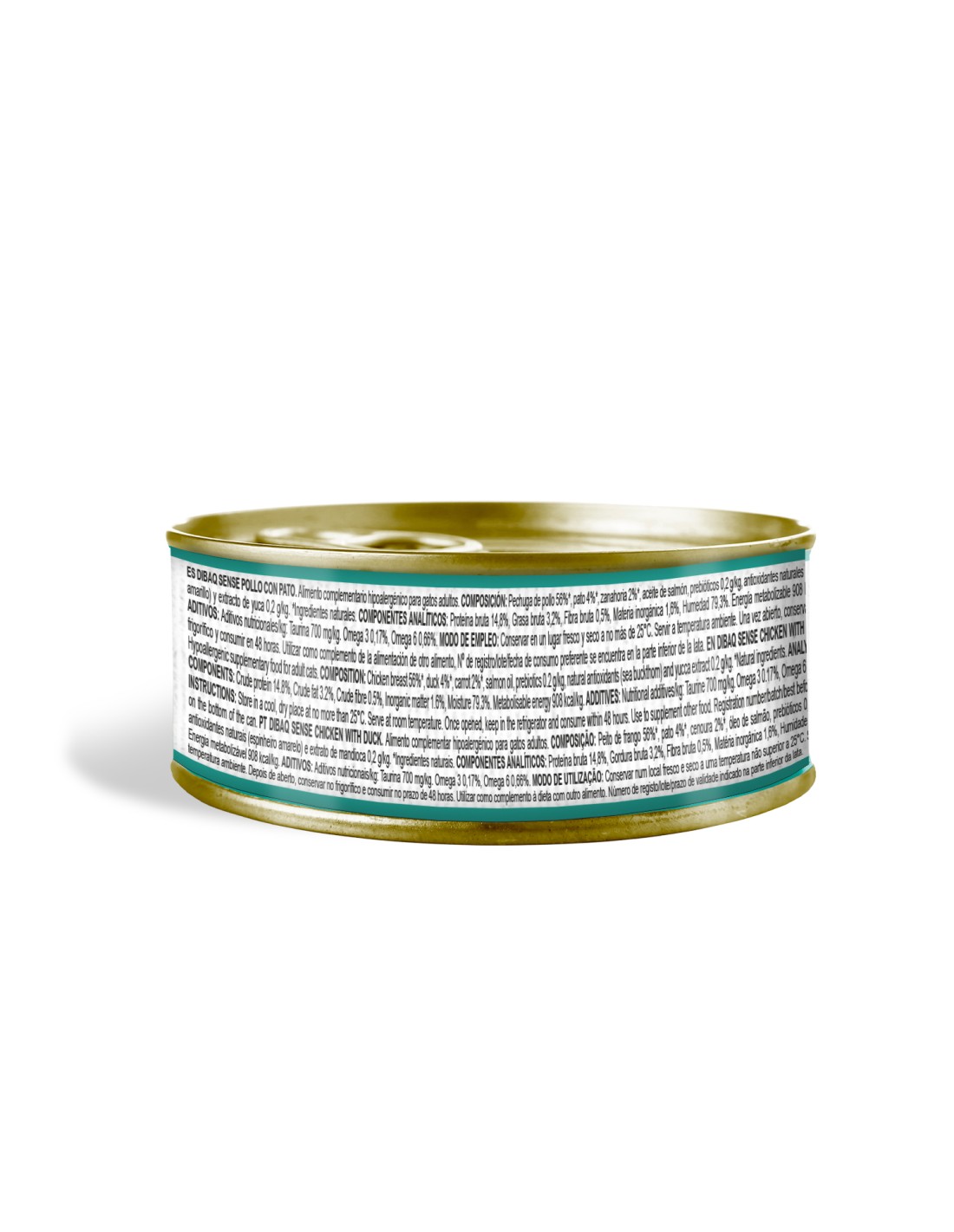 Dibaq Sense Cat Grain Free latas de 70g é uma receita hipoalergênica feita com carne fresca de frango e pato, cenoura, prebióticos e extrato de mandioca.