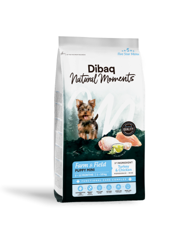 Dibaq Natural Moments Farm & Field Puppy Mini 2kg é um alimento natural completo e equilibrado projetado para filhotes de raça pequena. Feita com 45% de peru e frango como principais fontes de proteína animal, o arroz como único cereal (monogrão) e sem trigo, milho, soja ou ovos, esta ração promove uma digestão suave e um crescimento saudável desde os primeiros meses. Os seus pequenos croquetes (6-8 mm) adaptam-se à mandíbula dos mini cachorros e oferecem um sabor irresistível.