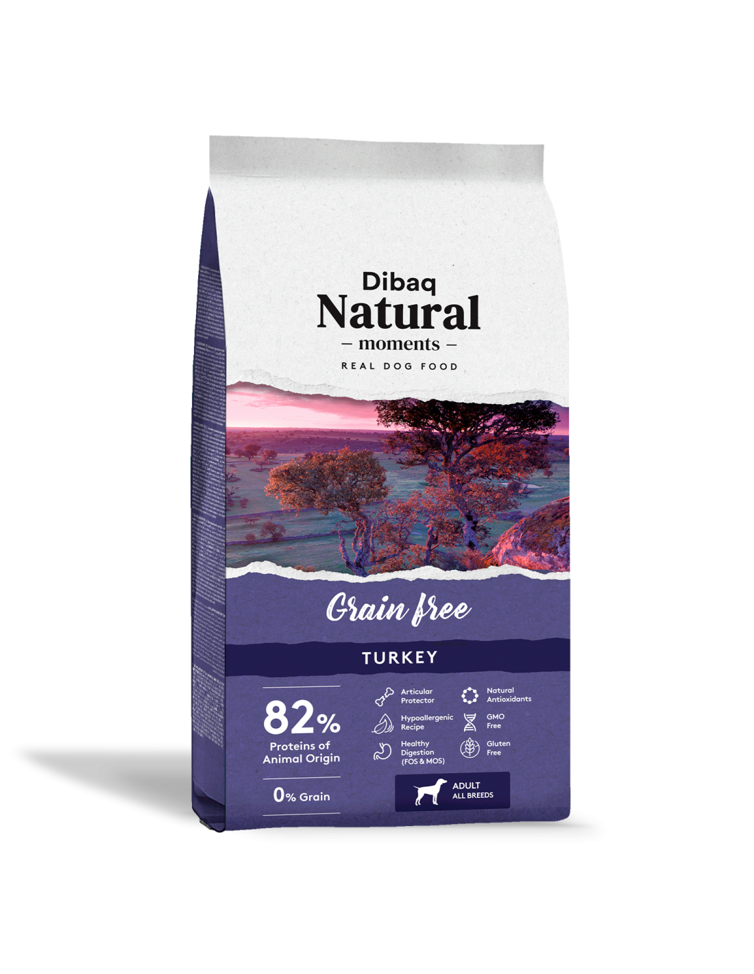 Dibaq Natural Moments Grain Free Turkey é um alimento hipoalergênico sem grãos com até 95% de proteína de origem animal para cães adultos de todas as raças.