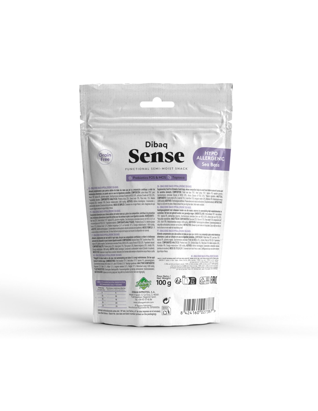 Dibaq Sense Snack Hipoalergénico é um snack semi-húmido elaborado com robalo fresco, peru e tapioca. Ingredientes naturais que ajudam a melhorar a digestão e a prevenir alergias ou intolerâncias alimentares.
